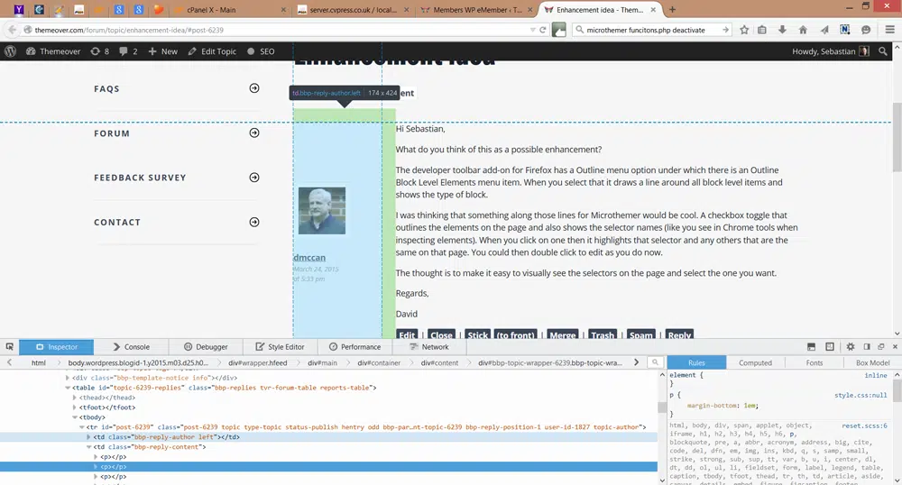 Heads up! this post was created when Microthemer was at version 3. The current version is 7. Some references to the interface may be out of date. Hi Sebastian, What do you think of this as a possible enhancement? The developer toolbar add-on for Firefox has a Outline menu option under which there is an Outline Block Level Elements menu item. When you select that it draws a line around all block level items and shows the type of block. I was thinking that something along those lines for Microthemer would be cool. A checkbox toggle that outlines the elements on the page and also shows the selector names (like you see in Chrome tools when inspecting elements). When you click on one then it highlights that selector and any others that are the same on that page. You could then double click to edit as you do now. The thought is to make it easy to visually see the selectors on the page and select the one you want. Regards, David |