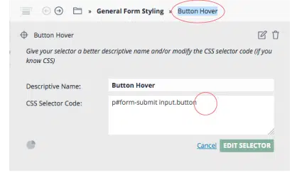 Optional Extra: if you notice that the button changes appearance very briefly during the mouse click action, this will be due to styles being applied by an :active pseudo selector somewhere in your theme. To override such styles, repeat the same copying process you did to create a hover selector (copy the original button selector) . But set the selector label to “My Button Active“. And type :active immediately after the code that is already there. You can then apply styles to change how the button looks at the exact moment the user clicks on it.